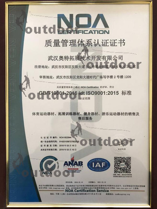 2008年公司通過ISO9001質量管理體系認證,所生產的拓展訓練器材獲得權威機構的檢測,產品符合國家相關標準。在產品科研和設計開發方面,公司還與武漢建工設計院、湖北工業大學、武漢園林景觀設計院等多家大專院校和科研機構建立了穩定的合作關系。