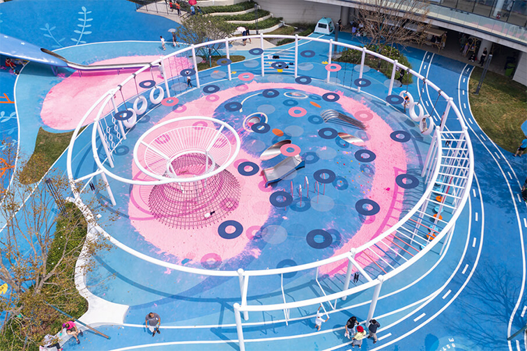 這是一款以 “月亮與星空” 為設(shè)計(jì)靈感的沉浸式戶外游樂設(shè)施,整體采用夢(mèng)幻藍(lán)粉漸變配色,地面印著錯(cuò)落的星空?qǐng)A環(huán)圖案,營(yíng)造出浪漫的宇宙氛圍。