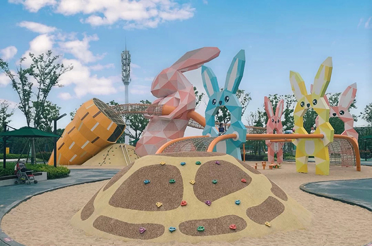 這是一款以幾何萌兔與巨型胡蘿卜為核心元素的沉浸式戶(hù)外游樂(lè)設(shè)備,粉、藍(lán)、黃等明快的馬卡龍配色,搭配棱角分明的動(dòng)物造型,打造出充滿(mǎn)童話(huà)感的視覺(jué)效果。
