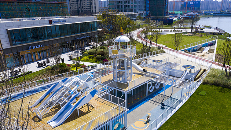 設(shè)備集多元游樂體驗于一體:競速滑梯帶來俯沖滑行的刺激,多層攀爬網(wǎng)與坡道可鍛煉孩子的肢體力量與協(xié)作能力,瞭望塔觀景平臺則能俯瞰周邊風(fēng)景。它的開放式甲板設(shè)計也為親子互動、社交玩耍提供了開闊空間。