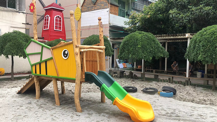 • 這是一款以萌趣蜜蜂為設計原型的戶外滑梯游樂設備,采用天然原木搭配明快的黃、綠配色,還原蜜蜂與蜂巢的視覺特征,造型可愛且充滿自然童趣。