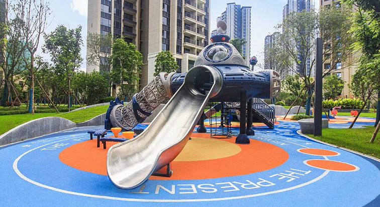 這是一款以宇宙飛船為設(shè)計(jì)原型的太空主題戶外滑梯,采用深邃的金屬藍(lán)搭配銀灰色艙體,點(diǎn)綴雷達(dá)、舷窗等細(xì)節(jié)裝飾,仿佛一艘停靠在社區(qū)的星際戰(zhàn)艦,視覺上充滿科技感與未來感。