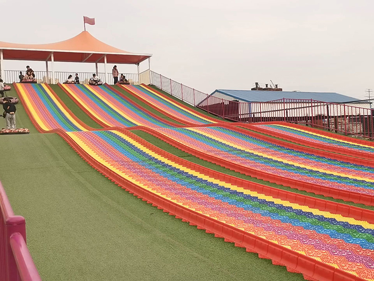 這是一款以彩虹色為視覺(jué)核心的無(wú)動(dòng)力旱雪滑道,采用紅、橙、黃、綠、藍(lán)、紫等明快色彩拼接成多條并行滑道,搭配緩坡地形與防滑毯面,營(yíng)造出充滿活力的游樂(lè)氛圍。