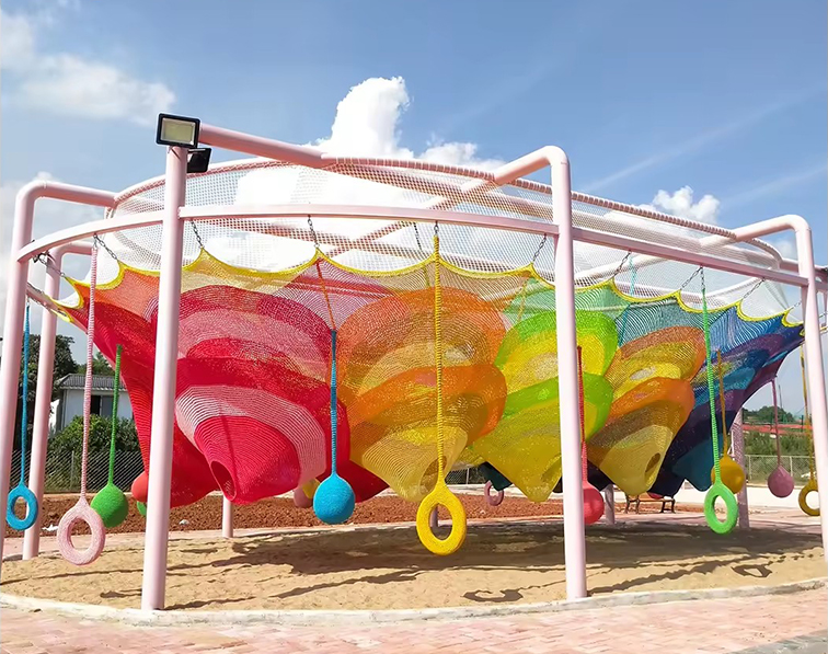 • 這是一款以彩虹漸變彈力網(wǎng)為核心的無動力戶外游樂設備,粉白金屬框架支撐起色彩繽紛的巨型網(wǎng)體,紅、橙、黃、綠、藍的漸變紋理如漂浮的彩色云朵,搭配懸掛的彩色圓環(huán)、吊球等互動裝置,視覺上充滿夢幻童趣。