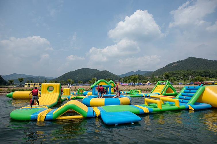 • 這是一款依托開闊湖面打造的無動力水上充氣闖關設備,由黃、綠、藍三色充氣模塊拼接而成,包含滑梯、障礙浮臺、攀爬通道等豐富關卡,造型明快活潑,與湖光山色形成清新治愈的視覺效果。