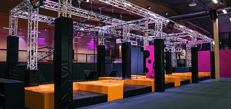 • 這是一款專為追求刺激與競(jìng)技感的年輕客群打造的室內(nèi)闖關(guān)游樂設(shè)備,以工業(yè)風(fēng)鋼架結(jié)構(gòu)為骨架,融合吊環(huán)、懸掛平臺(tái)、繩網(wǎng)攀爬、奶酪墻等經(jīng)典忍者勇士關(guān)卡模塊,搭配黑、橙、粉的撞色設(shè)計(jì)與霓虹燈光,整體如一座充滿動(dòng)感的極限挑戰(zhàn)場(chǎng),兼具硬核質(zhì)感與潮流氛圍。