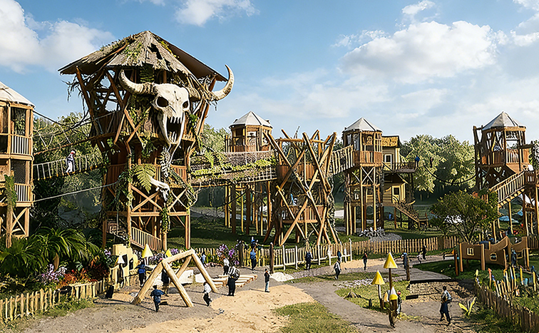 這是一款沉浸式原始部落風(fēng)室外拓展游樂(lè)設(shè)備,以巨型牛頭圖騰樹(shù)屋為核心,打造出多層錯(cuò)落的木質(zhì)樹(shù)屋群與高空棧道,搭配茅草屋頂與仿真綠植,營(yíng)造出神秘的蠻荒部落氛圍。主體采用環(huán)保防腐實(shí)木搭建樹(shù)屋與棧道,搭配玻璃鋼圖騰雕塑與鋼索系統(tǒng),既還原了部落的質(zhì)樸野性,又保障了結(jié)構(gòu)穩(wěn)固與游玩安全。設(shè)備集高空行走、樹(shù)屋探索、親子互動(dòng)于一體,適用于主題樂(lè)園、自然景區(qū)、研學(xué)基地等場(chǎng)景,讓孩子們?cè)诔两降牟柯涮诫U(xiǎn)中,鍛煉體能、勇氣與團(tuán)隊(duì)協(xié)作能力,開(kāi)啟一段充滿(mǎn)原始魅力的探險(xiǎn)之旅。