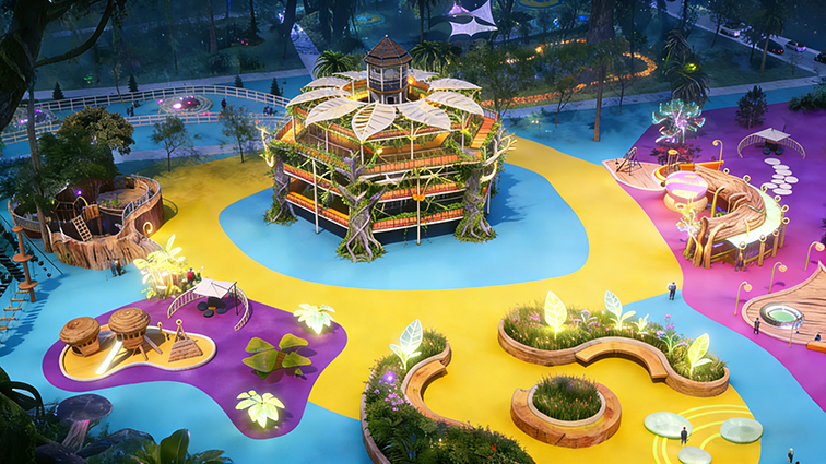 這是一款沉浸式奇幻風(fēng)格室外拓展游樂設(shè)備,以熒光森林秘境為設(shè)計靈感,打造出多層錯落的樹屋平臺、蜿蜒棧道與發(fā)光互動裝置,搭配大面積彩色地面與仿真綠植,營造出夢幻的夜間探險氛圍。主體采用環(huán)保防腐實木搭建樹屋與棧道,搭配高強度鋼材框架與 LED 燈光系統(tǒng),既保障了結(jié)構(gòu)穩(wěn)固與游玩安全,又通過鮮明色彩與發(fā)光裝置形成強烈視覺沖擊。設(shè)備集高空行走、親子互動、沉浸式打卡于一體,適用于主題樂園、文旅綜合體、研學(xué)基地等場景,讓游客在奇幻森林中鍛煉平衡感、勇氣與探索精神,開啟一段充滿驚喜的熒光探險之旅。